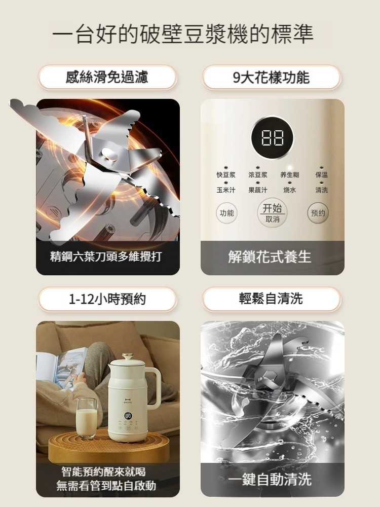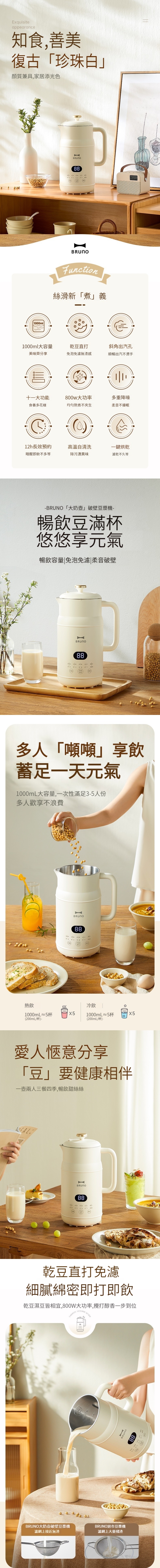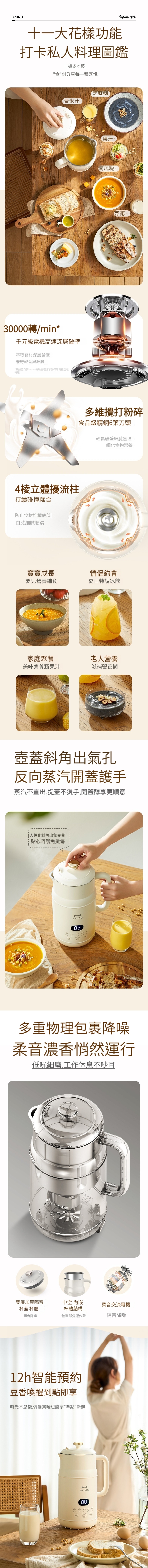BRUNO豆漿破壁機是一款來自日本設計的高品質豆漿機,多項優點,包括低噪音、免過濾、無渣感覺、12小時智能預約、自動清洗等,這些功能使得使用者可以輕鬆製作出各種美味飲品,包括沙冰、甜品、豆漿等,一機多用,非常方便實用。