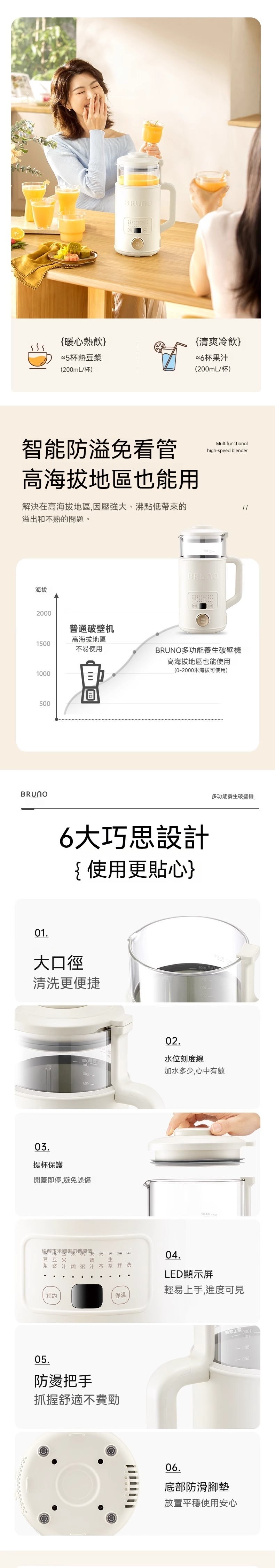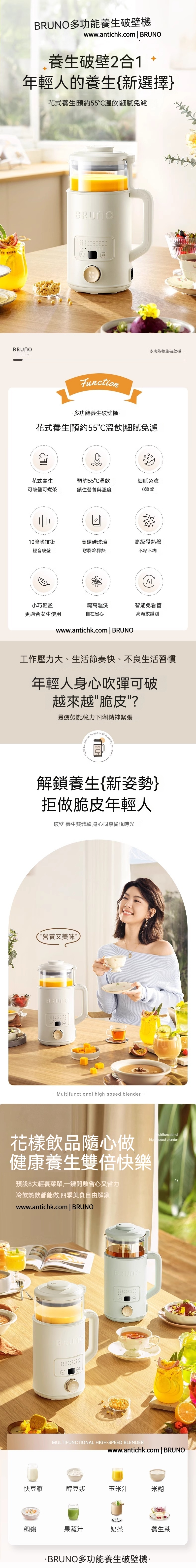 BRUNO 這款多功能養生破壁機,它是您廚房的革命性產品!這款攪拌機提供細膩免濾的體驗,可以直接打乾豆而無需浸泡,確保順滑口感,不會卡喉。它不僅是一款攪拌機,還可以煮茶,並使用預約功能在55°C溫度準確飲用。擁有10項降噪技術,運行時安靜無聲。其小巧輕盈的設計特別適合女性使用者。具有一鍵高溫清洗功能,是智能設計,讓使用更輕鬆。立即升級您的攪拌體驗,選擇這款多功能養生破壁機!