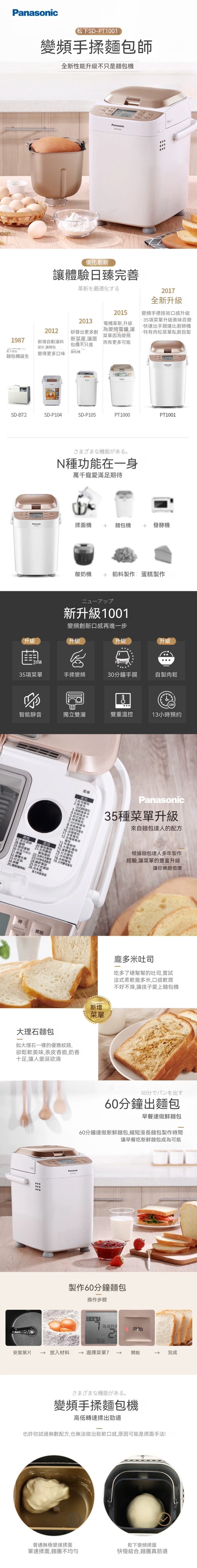 Panasonic WTP1001 麵包機是一款出色的家用麵包機,具有多項令人驚艷的功能和特點。這款麵包機具有快速出麵包的能力,只需60分鐘即可享受到新鮮烘焙的麵包。它還升級了35種菜單,讓您可以輕鬆製作各種不同的麵包款式。