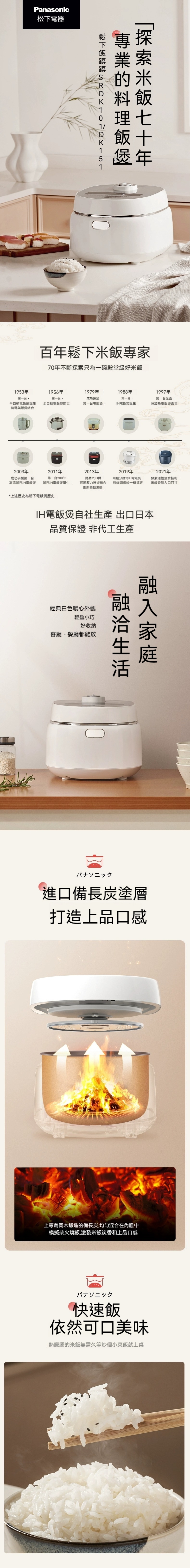 Panasonic智能電飯煲是一款引人注目的家用電器。該電飯煲以其獨特的備長炭釜聞名,並致力於將傳統與創新相結合,以改善和提高社會生活。自從1953年以來,Panasonic一直努力創新,以滿足人們對優質食物的需求。