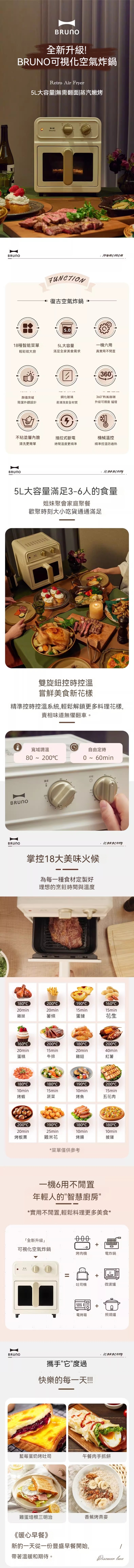 BRUNO氣炸鍋是一款功能強大、外觀精美的廚房家電。它擁有超大5公升容量,足夠滿足您家庭或聚會的烹飪需求。此外,BRUNO氣炸鍋還擁有20個智能菜單選擇,您只需要按下按鈕,就可以輕鬆烹製出美味可口的料理,省時省力,更加便捷。