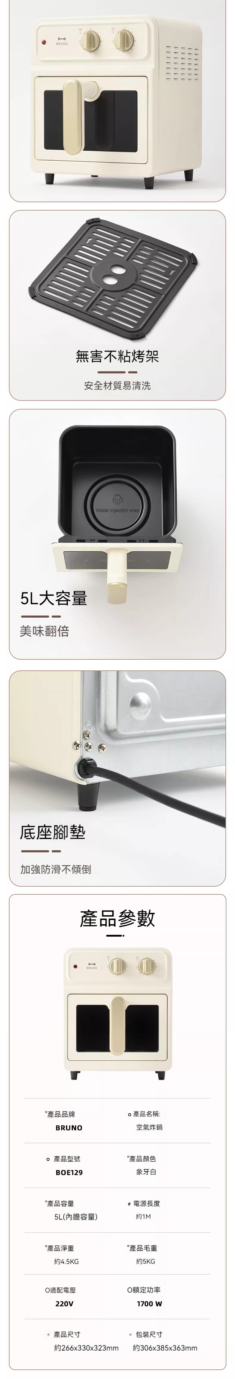 【全球配送】日本 BRUNO 360° 無油 5L 特大呎寸智能氣炸鍋 AirFryer|香港發送