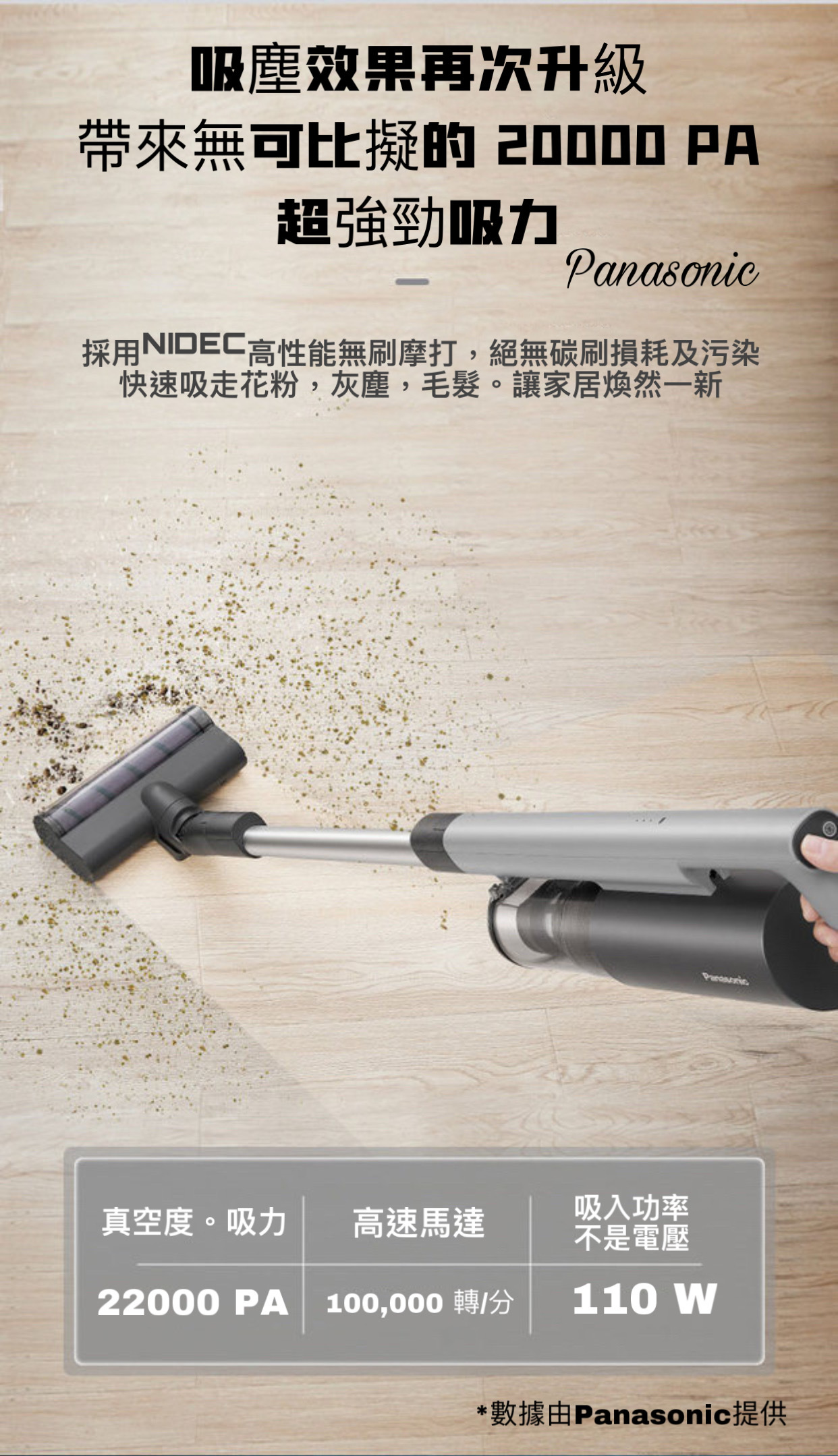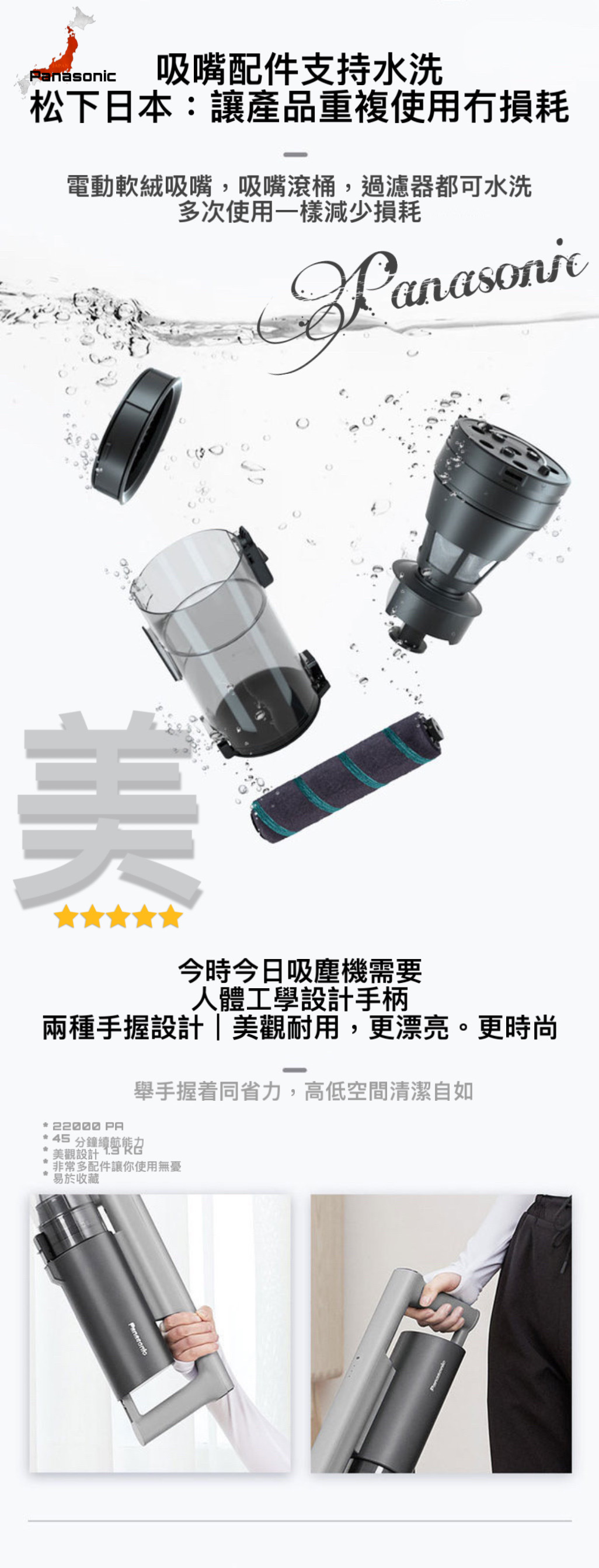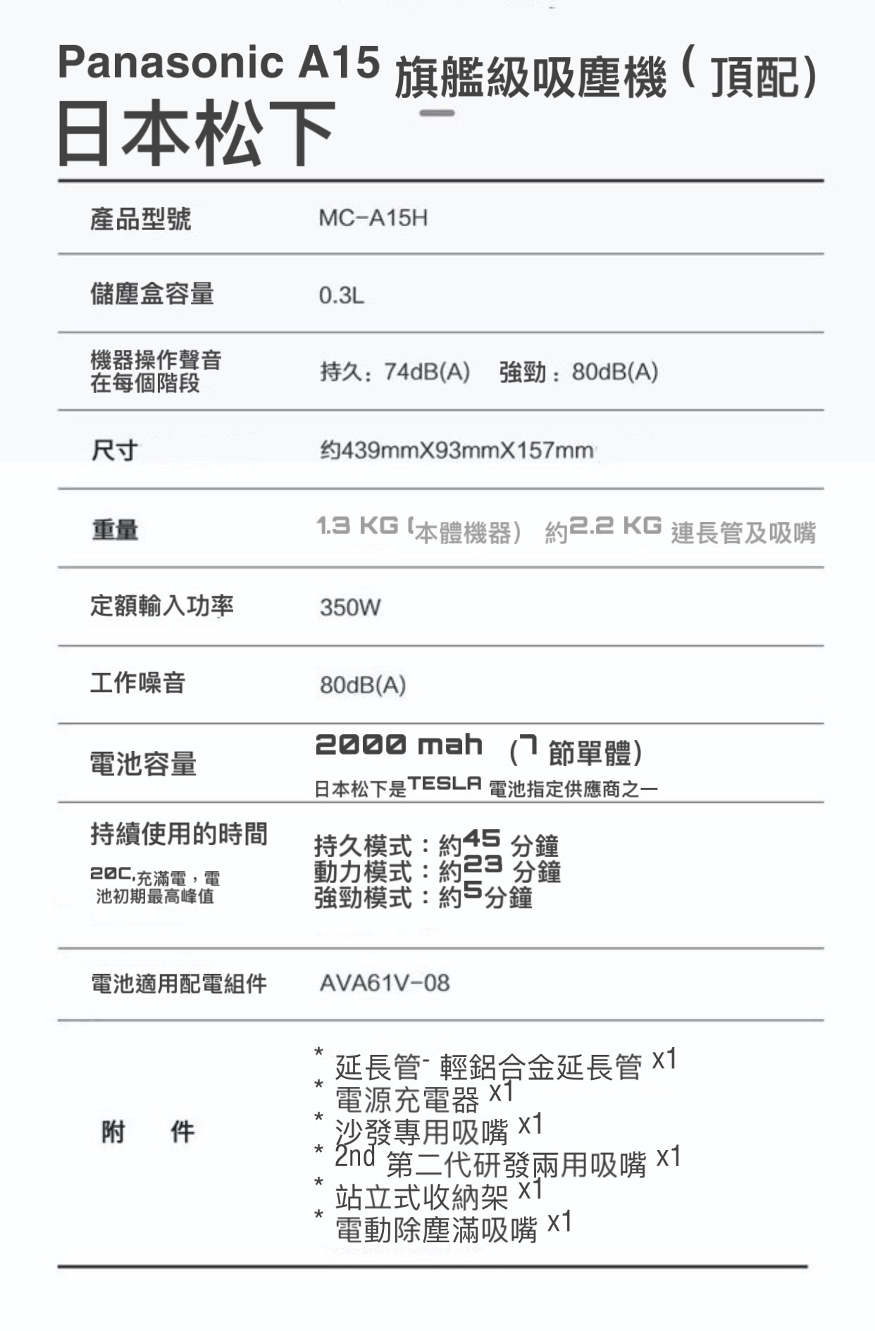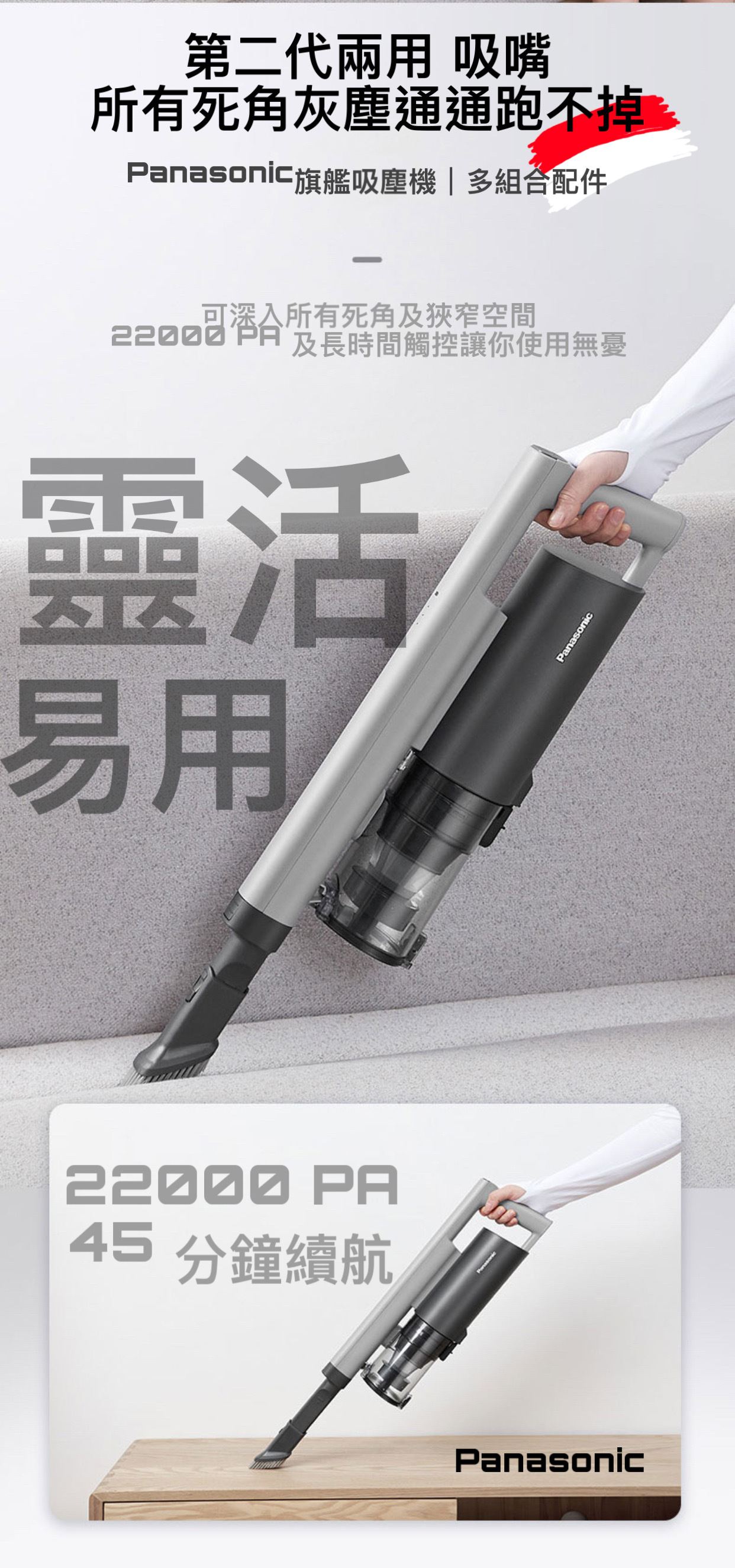 日本 Panasonic 松下旗艦級A 15手提吸塵機採用簡約機身,續航能力45 分鐘。